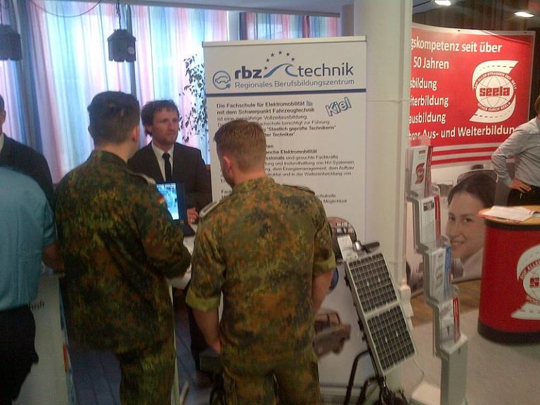 Bereits zum zweiten Mal haben wir uns an der Kontaktmesse der Bundeswehr beteiligt. Das Interesse an einer Weiterbildung zum Staatlich geprüften Techniker war seitens der Soldaten enorm. Unser Messestand wurde rege frequentiert, der Fachschüler Christian Schmidt beantwortete alle Fragen rund um die Ausbildung souverän. Auch der Vortrag von Matthias Nienaß zum Thema stieß auf starkes Interesse. Nun hoffen wir, dass sich die Begeisterung auch in den Anmeldezahlen wiederspeigelt.