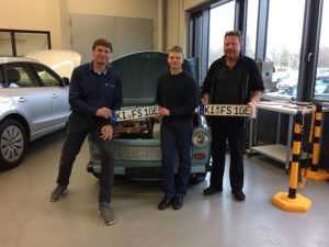 Auf Kieler Straßen war er eher selten zu sehen: unser RBZ-E-Trabi, der sich lautlos, geruchslos aber doch rasant bewegen lässt. Das soll sich nun ändern. Herr Frevert und Herr Geppert haben es möglich gemacht: sie haben eine Straßenzulassung erwirkt, d.h. er kann als „Dienstfahrzeug“ genutzt werden. Die Jungfernfahrt mit dem amtlichen Kennzeichen KI-FS 2010 E steht noch aus.