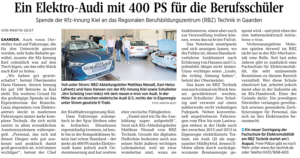 dung!Audi e-tron 55 heißt der neueste Lernträger für die Kfz-Ausbildung, der mit eigenen Mitteln und einer Spende der Kfz-Innung Kiel-Neumünster angeschafft worden ist. Am 09.06.2022 wurde uns das Fahrzeug offiziell durch den Kfz-Obermeister Hans Hansen und den Innungsvorstand Karl-Heinz Lafrenz übergeben und kann nun für eine hochwertige Berufsschulausbildung genutzt werden. 2,6 Tonnen Elektromobil mit einem 700 kg schweren Akku verdeutlichen die gute Zusammenarbeit der Dualpartner und bestromen unseren Technikunterricht.